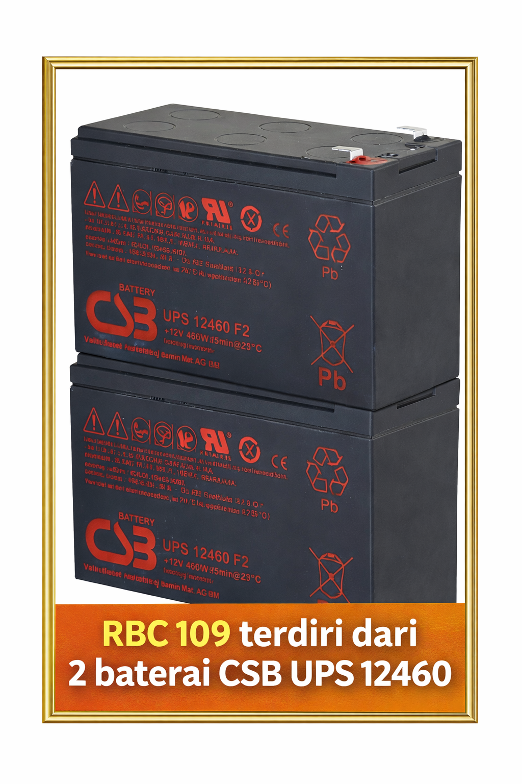 Secara teknis, APC RBC 109 menggunakan baterai VRLA AGM (Valve Regulated Lead Acid – Absorbent Glass Mat) tipe high-rate UPS battery. Salah satu baterai yang umum digunakan dan setara secara teknis adalah CSB UPS Series 12V, seperti tipe UPS 12460.