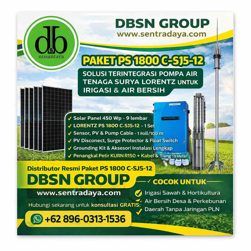 Pompa Air Lorentz PS2-1800 C-SJ5-12 adalah solar pump kelas profesional yang dirancang untuk menghasilkan debit besar, bekerja stabil sepanjang hari, serta menghilangkan kebutuhan solar dan listrik PLN sepenuhnya. Dengan teknologi motor brushless DC dan sistem MPPT canggih, pompa ini menjadi pilihan terbaik bagi petani modern yang ingin meningkatkan efisiensi irigasi tanpa membayar biaya operasional harian.